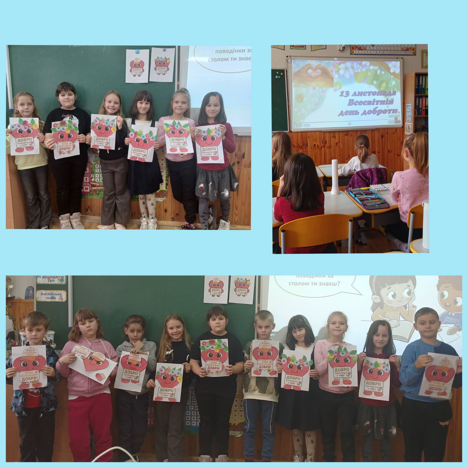 Першокласники теж не залишилися осторонь. У 1-А класі (вчитель Заєць О.О.) відбувся урок “Даруй добро”, під час якого учні створили велику мегарозмальовку “Життя дано на добрі справи”. Разом вони малювали ситуації, у яких добро живе поруч із ними — у школі, вдома, серед друзів.