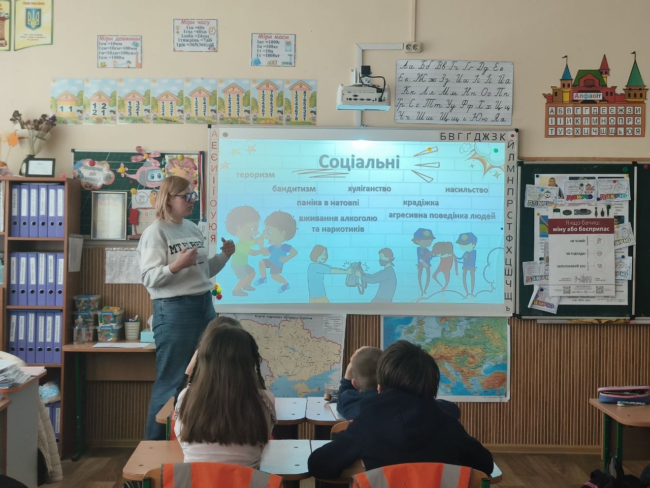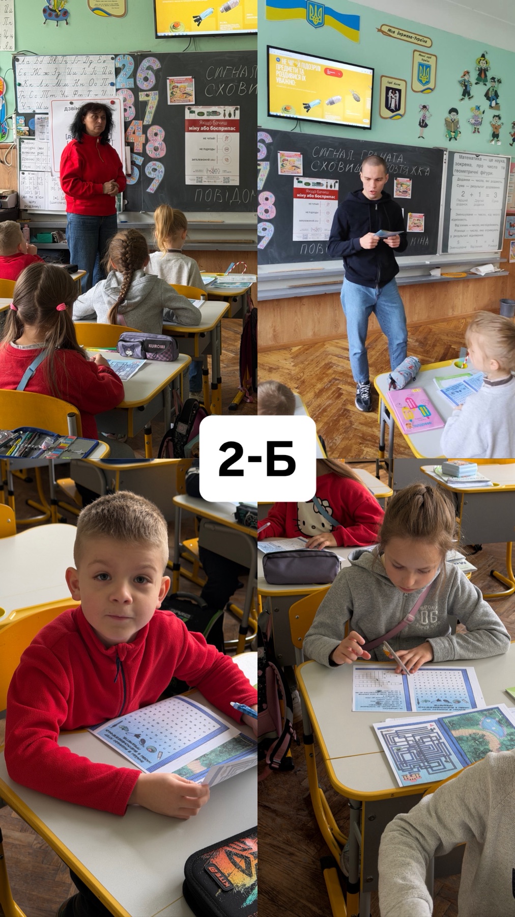 У 2-Б класі разом із Черевко Т.С. учні вивчали тему вибухонебезпечних предметів: сигналів небезпеки, мін, гранат, розтяжок та правил поведінки у разі їх виявлення. Практичним завданням стало тематичне мовне заняття — пошук і виділення назв небезпечних предметів.