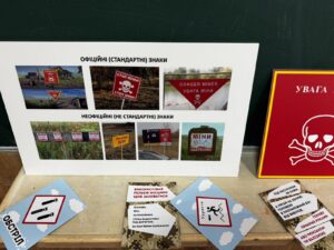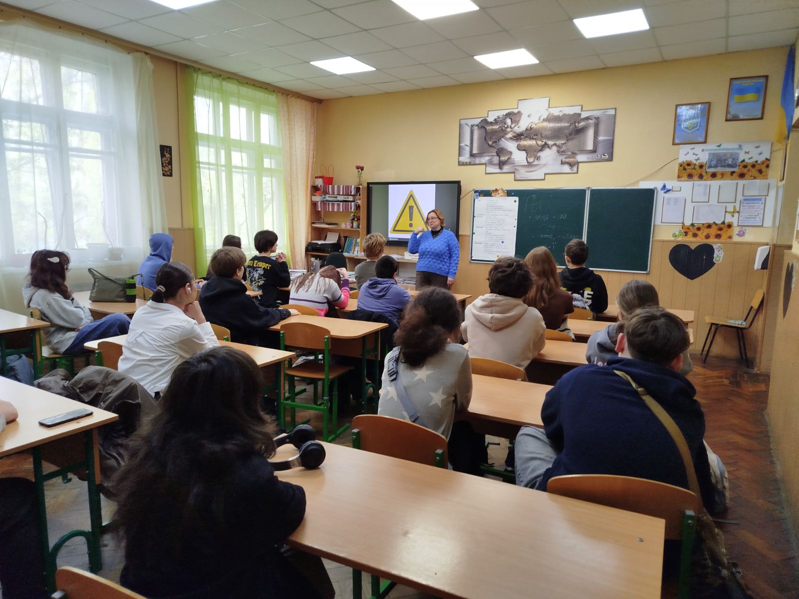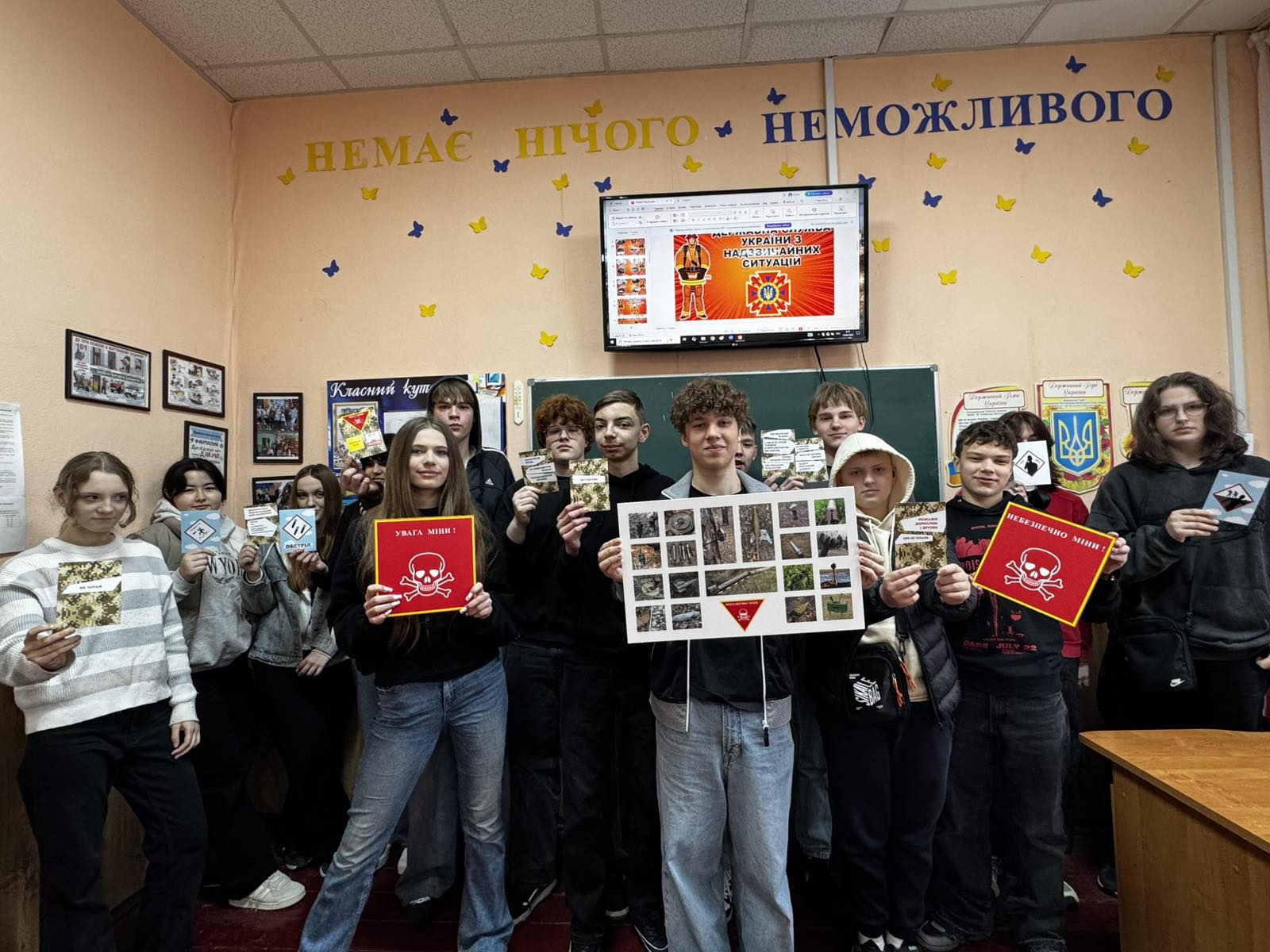 Учні 9-А класу разом із класним керівником Шосталь Ю.Л. опрацювали тему мінної безпеки. Діти переглядали презентацію, знайомилися з попереджувальними знаками, а також працювали зі спеціально підготовленим стендом і буклетами з правилами безпечної поведінки.