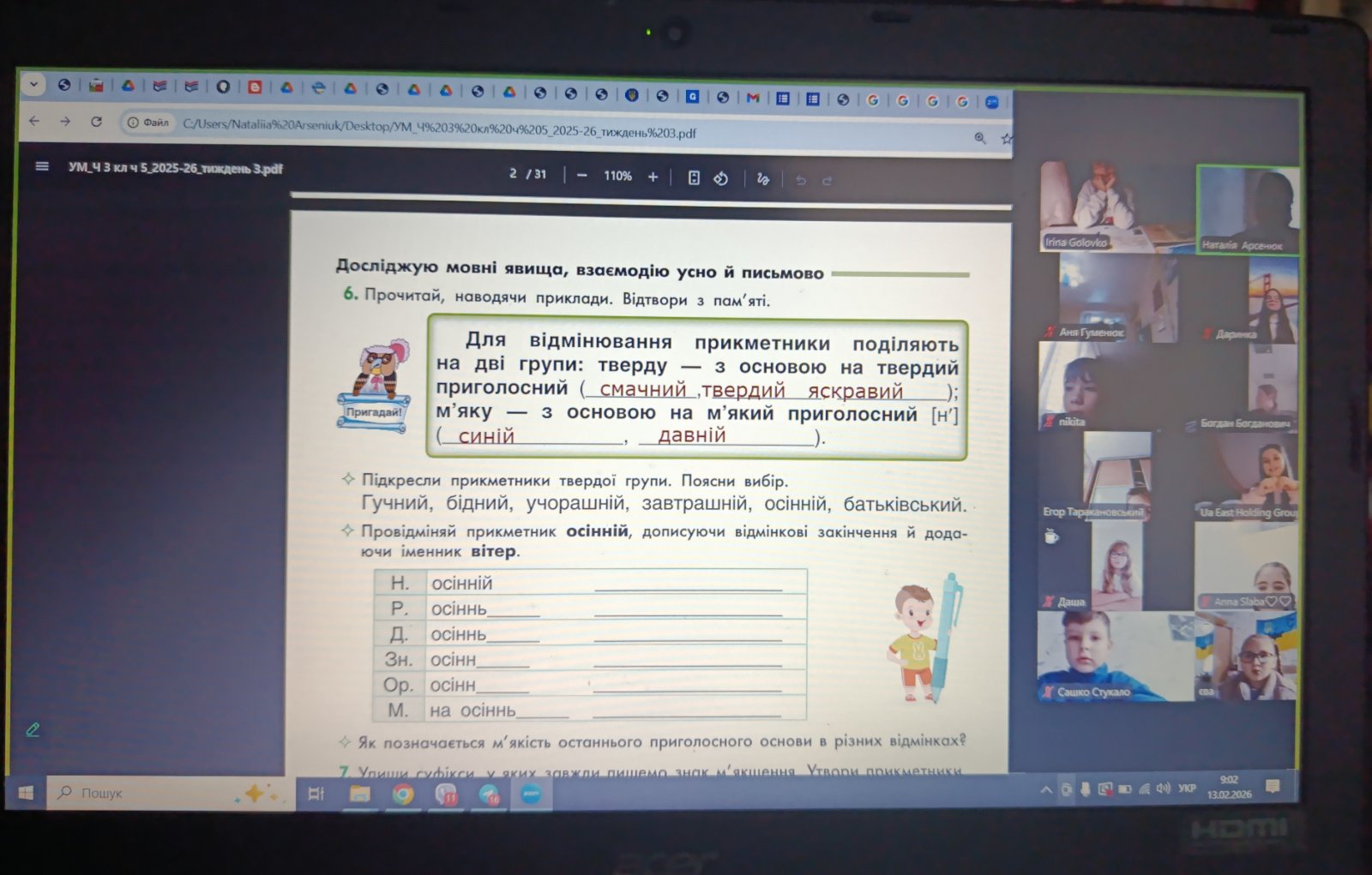 Під час навчальної вікторини з англійської мови (лексична тема “Countries and Money”) разом із Марією Леонідівною школярі повторювали лексику, відповідали на запитання та змагалися командами. З Арсенюк Н.О. діти вчилися змінювати прикметники разом з іменниками, складали словосполучення й речення, розвиваючи грамотність і мовну вправність.