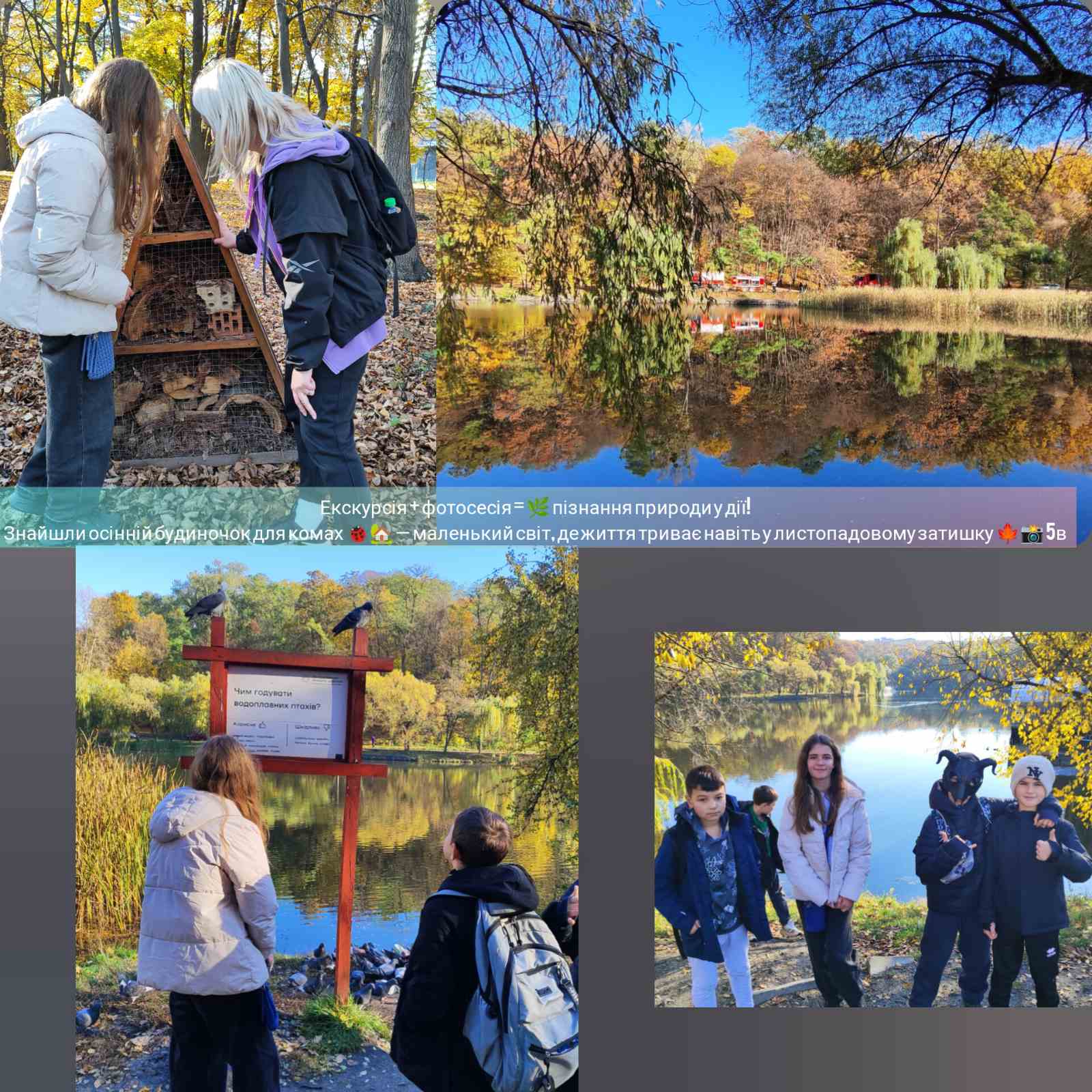 Учні 5-В класу вирушили на екскурсію Голосіївським парком, де на власні очі побачили, як природа вчить спостережливості й турботи. Біля озера діти бачили білочок, шукали черв’ячків, дізнавалися, чим правильно годувати водоплавних птахів, і вчилися берегти довкілля. Перегляд мультфільму «Звіропоїзд» допоміг ще глибше відчути гармонію світу тварин і замислитися над тим, як важливо бути добрим і уважним до всього живого.